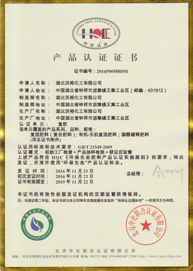 ??? 湖北沃裕化工有限公司成功獲得環(huán)保生態(tài)肥料產(chǎn)品認證。湖北沃裕一直以來就非常重視肥料產(chǎn)品的質(zhì)量和安全環(huán)保性能,堅守“四個確保”: