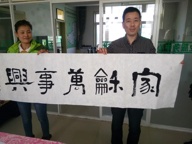 ? ? 就在當(dāng)天,中農(nóng)控股“農(nóng)惠網(wǎng)”康平縣級(jí)服務(wù)中心請(qǐng)來遼寧省美術(shù)家協(xié)會(huì)會(huì)員、著名書畫家于海江為“農(nóng)惠網(wǎng)”會(huì)員寫楹聯(lián)福字及橫軸縱軸書法作品。到場的“農(nóng)惠網(wǎng)”會(huì)員都很高興在中心社的會(huì)議室里布上桌案,熱情地等待書法家揮毫潑墨,都爭先恐后求墨寶。一天下來,于海江共計(jì)為“農(nóng)惠網(wǎng)”會(huì)員書寫了楹聯(lián)福字100多幅,題寫橫軸縱軸書法作品不計(jì)其數(shù)。